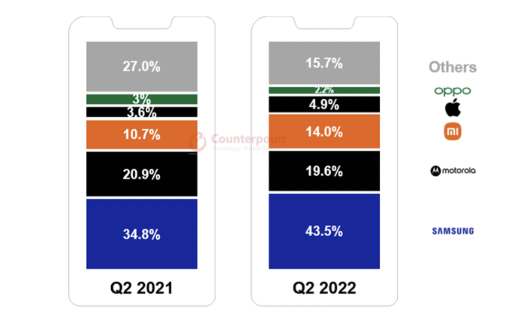 - 三星在 2022 年第二季度的出货量和比例均创前史新高。但是出货量微弱,出售却疲软,导致库存高企,在中高价位段产品的高库存问题尤为严峻。