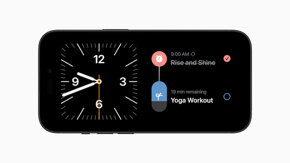 待机显现特别适宜在床头柜、厨房台面或桌面运用,并可进行特性化设置,显现多种精巧时钟、用户保藏的相片或小组件,并支撑智能叠放,在适宜的时刻显现适宜的小组件。待机显现还可全屏显现实时活动、Siri、来电和尺度更大的告诉。在支撑全天候显现的机型上,待机显现可持续显现有用信息;在夜间方式下,待机显现将习气弱光环境,以美丽的红色彩显现时钟、相片和小组件。运用 MagSafe 充电基座为 iPhone 充电时,待机显现可记住用户偏心的视图。